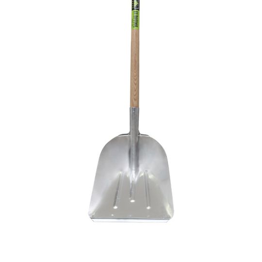 A large shovel with a reinforcing strip on the blade. The handle has a D-handle. The length of the shovel is 134 cm.